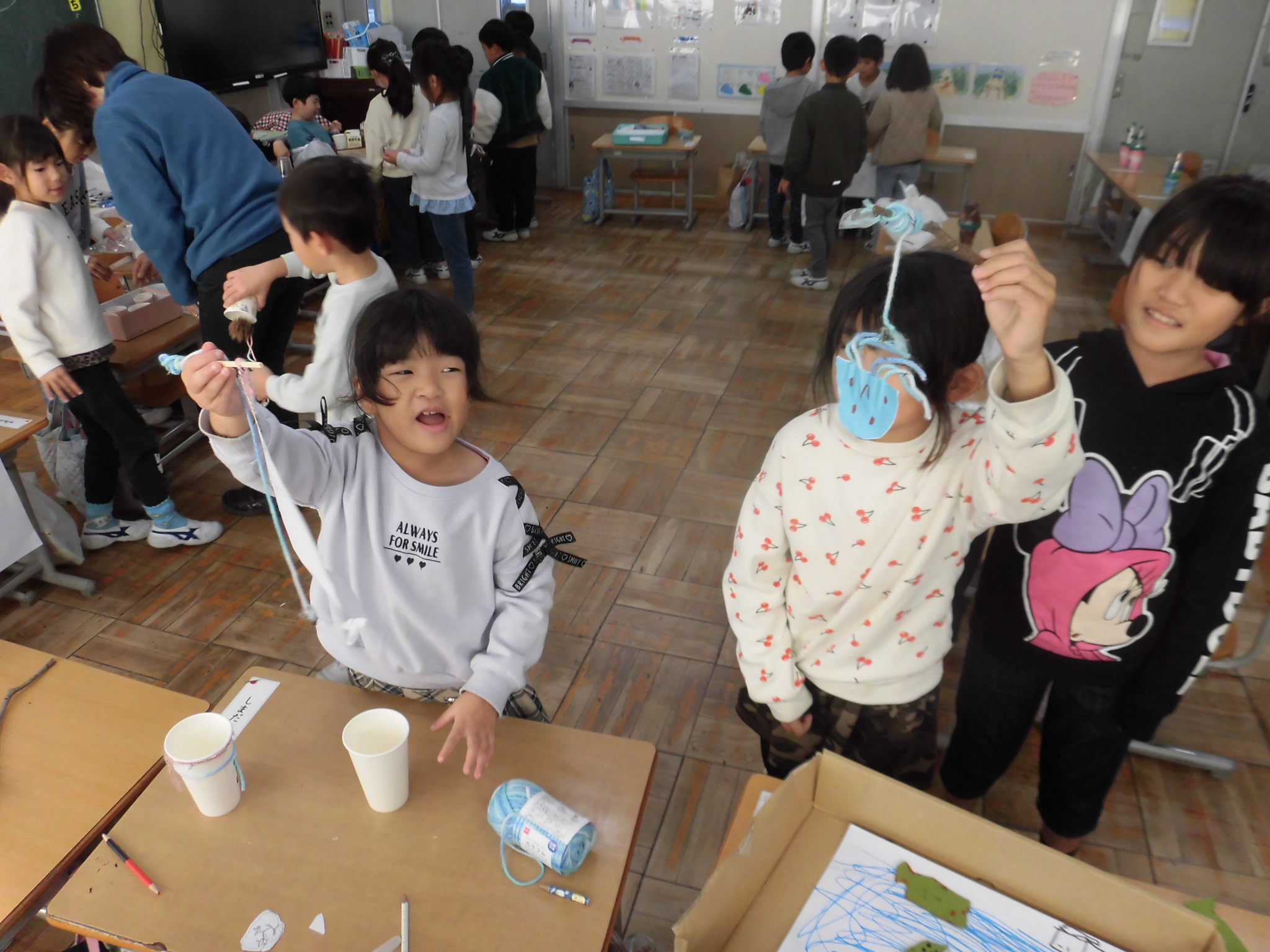 1年生が、生活科の学習で、松ぼっくりやどんぐりなど、秋の物を使って遊べるおもちゃを作りました。今日は、魚釣りや的入れ、やじろべえやけん玉など、友達が作ったおもちゃで遊びました。「大きい魚がつれた!」「こうするとうまくできるよ」お互いにアドバイスしながら、オリジナルのおもちゃで楽しく遊ぶことができました。