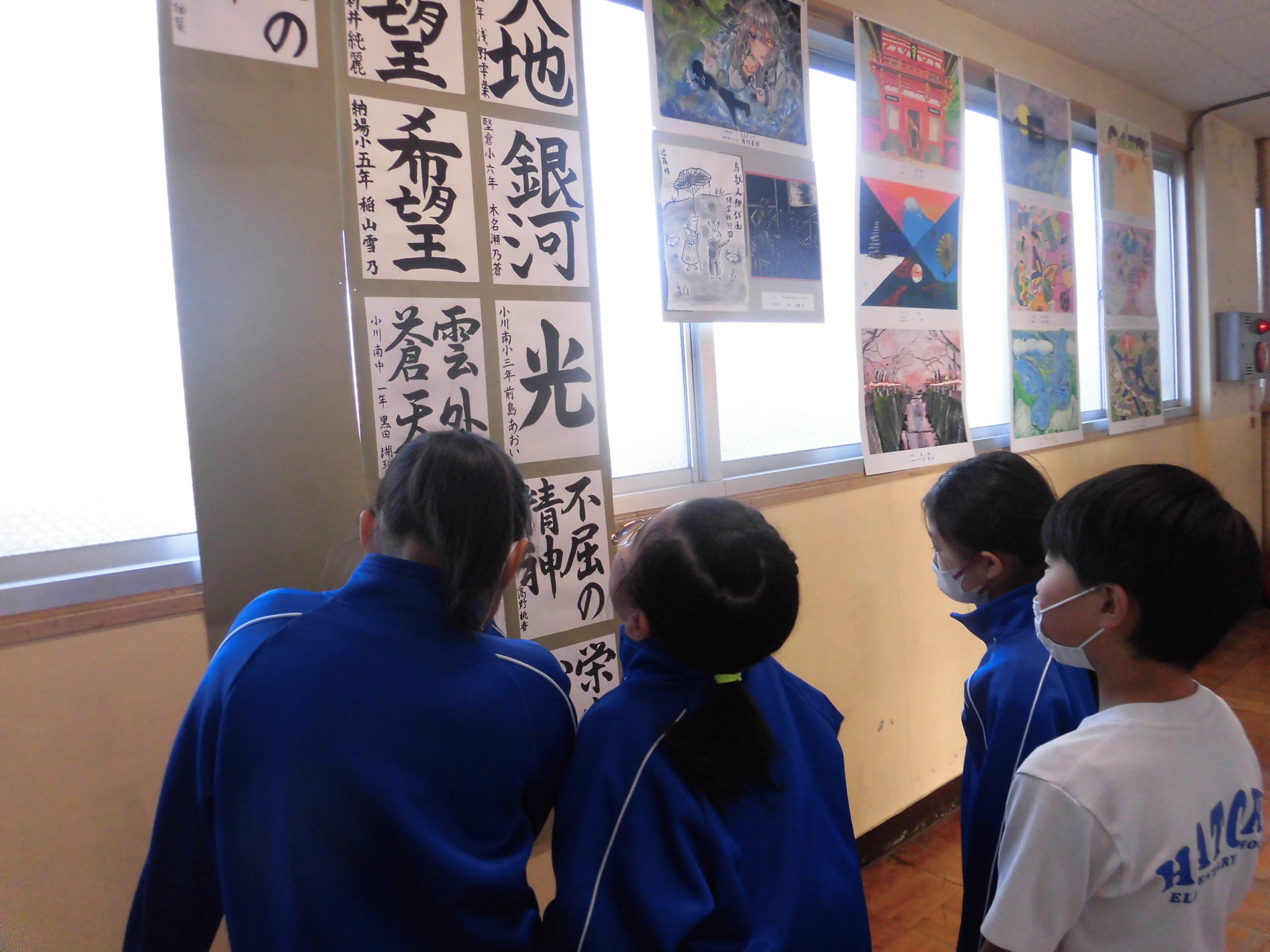 茨城県小中学校美術展覧会に入選した作品の巡回展が始まりました。書写と絵画で市内各学校の代表となった素晴らしい作品が職員室前廊下に展示されています。「これ上手!」「すご~い!これどうやって塗ってるのかなあ。」感心しながら熱心に鑑賞する姿が見られました。良い作品との出会いはきっと今後の活動に生かされることでしょう。