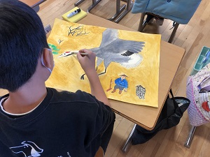 各教室では,県芸術祭に向けた絵画の学習が進められていました。6年生は,タブレットで撮影した画像を見て,光の具合いを確認しながら色ぬりをしていました。また,3・4年生の教室では,絵の具と水のバランスを見ながら筆を上手に使っている南っ子の様子が見られました。「その色ってどう作ったの?」「もう少し薄くした方がいいかな?」など,互いにアドバイスし,学び合い,取り組んでいる姿が,微笑ましかったです。