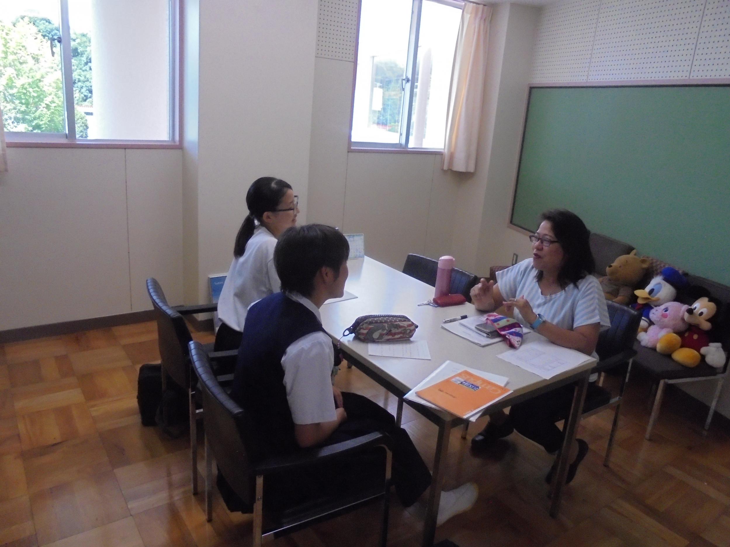 明日(1日)水戸合同庁舎で,インタラクティブフォーラム・中央地区大会があります。今日は最後の練習です,夏休み中のALT・リズ先生の協力してくれています。参加する内山さん,高村さんの健闘を祈りたいと思います。