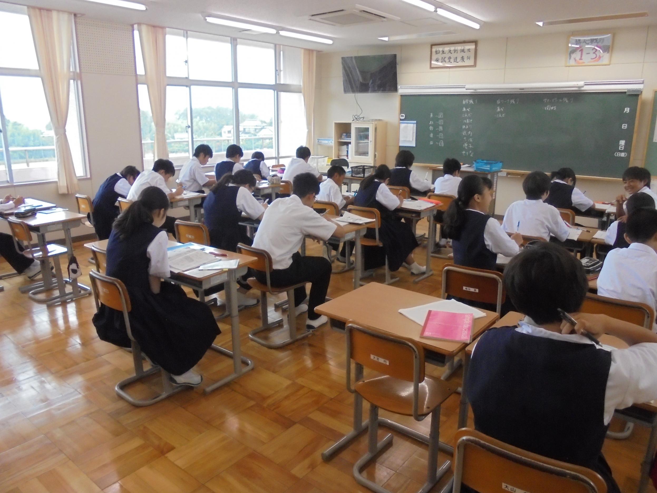 1,2年生は,「学年登校日」です。久しぶりに教室に入って,夏休みの課題の解答や自習を行いました。また,体育祭に向けての話し合いや学級旗の仕上げなども行われました。明日(11日山の日)新人戦のシード決めの試合などがある部活動が多く,ほとんどの生徒が,お弁当を食べて,午後からは部活動に参加していました。