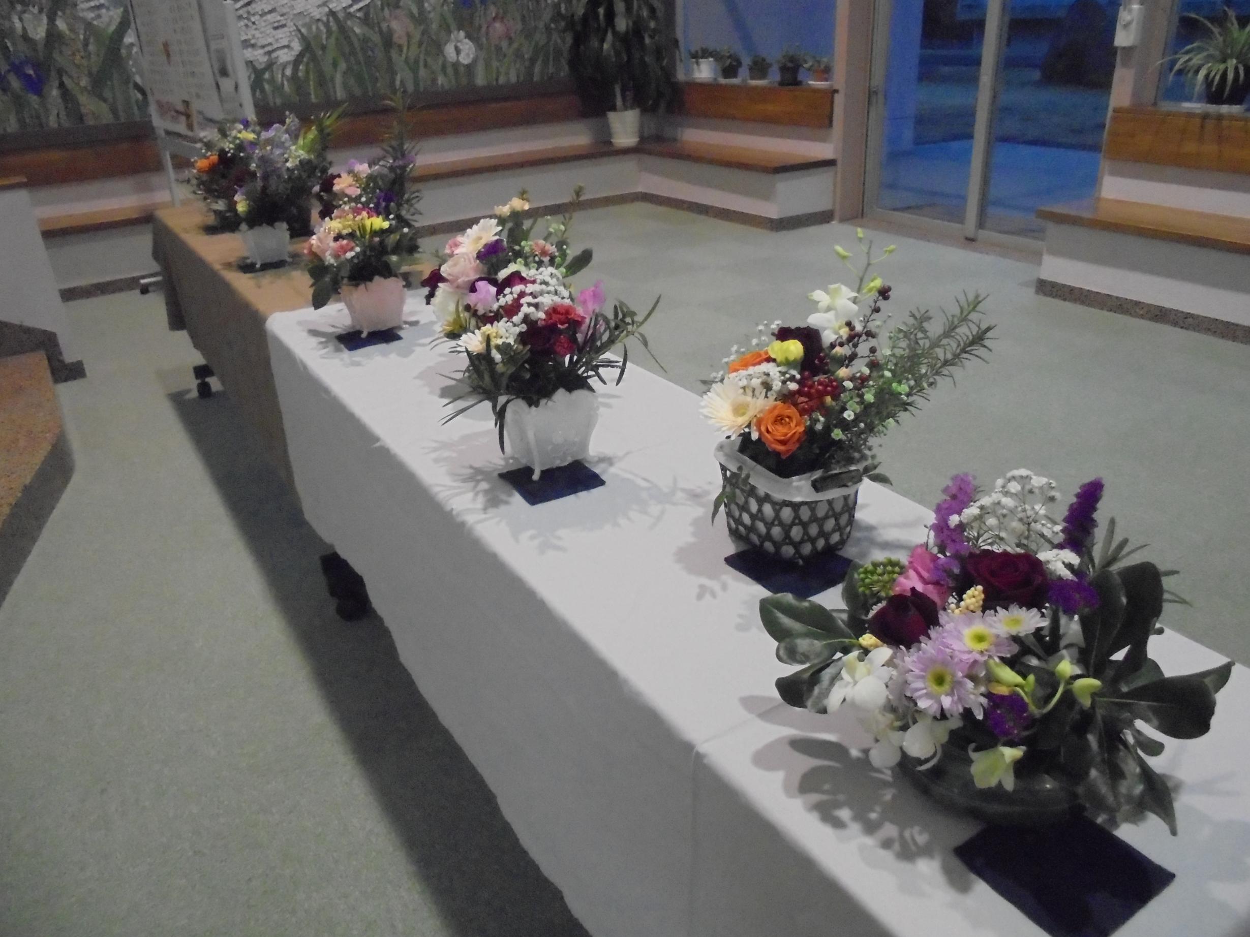 文芸部の皆さんが,顧問の遠藤先生のお知り合いの友常様に指導を受け,「フラワーアレンジメント」に挑戦しました。出来上がった作品は生徒ホールに展示されています。どれもとてもきれいに仕上がっていました。
