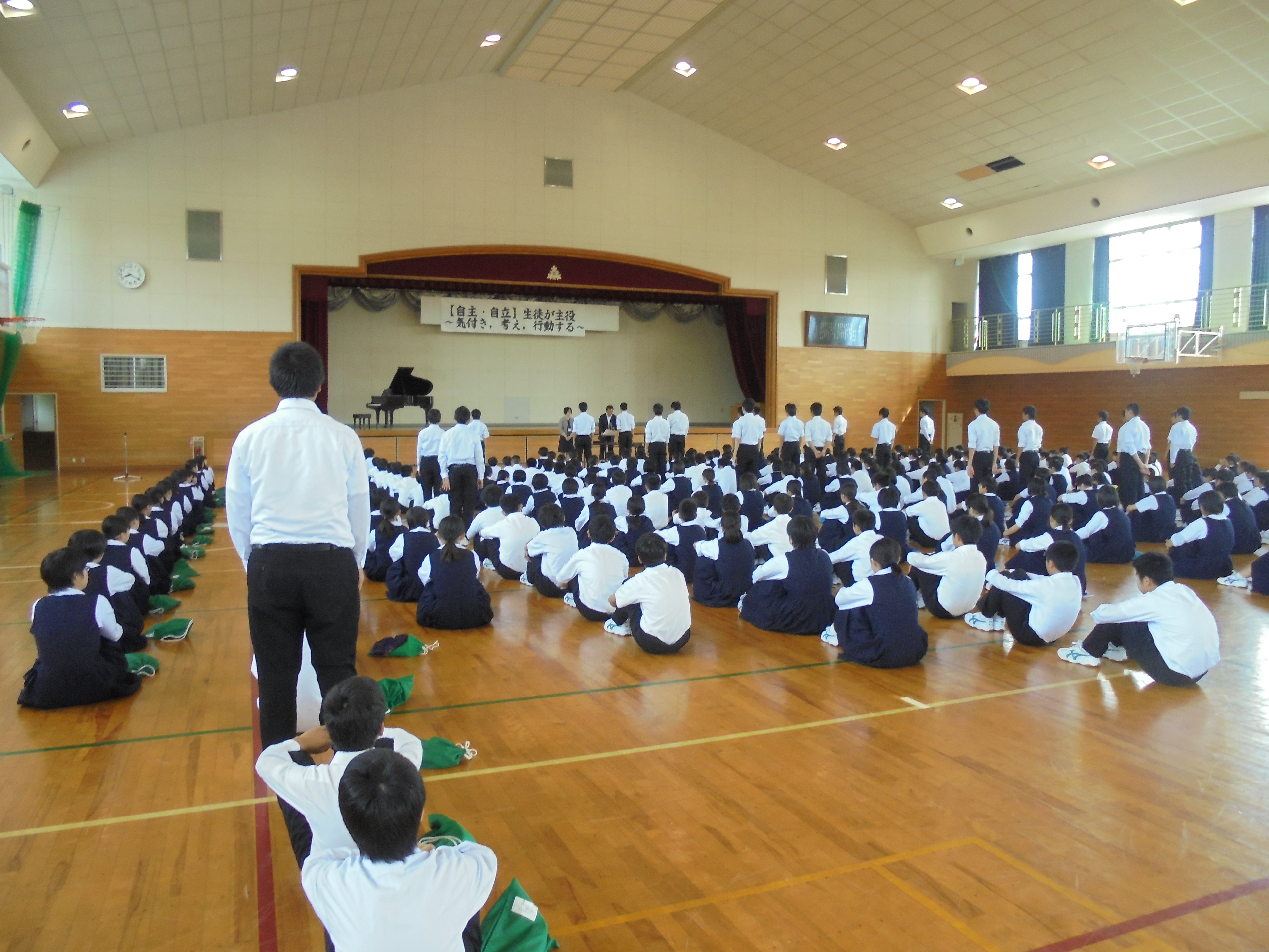 先日行われた,東茨城地区陸上大会(男子3位,女子2位,総合3位)の表彰がありました。また,青少年健全育成標語優秀賞(小野木さん,川村さん,会田さん,小沼さん,塩野さん)の表彰も行われました。最後に,昨年度まで指定を受けていた「金融教育研究校」への感謝状の発表もありました。