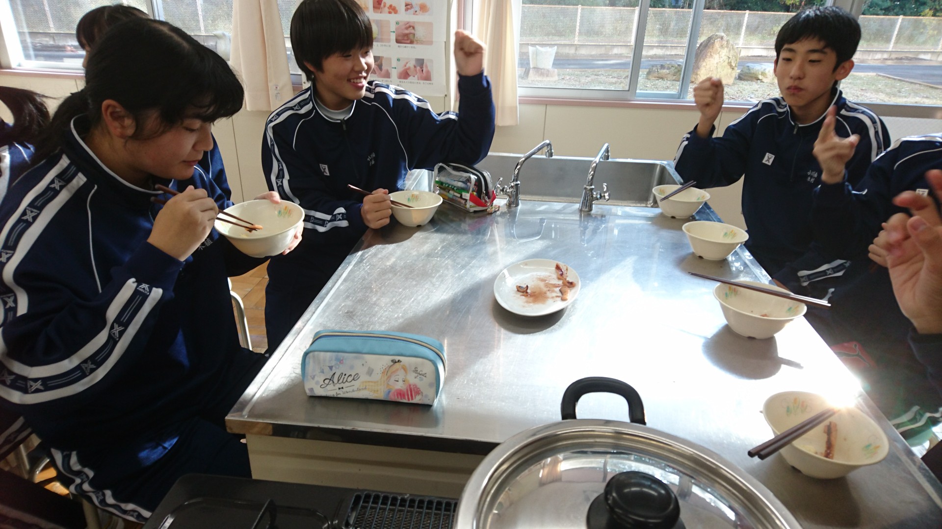 2年生の理科の授業で「イカの解剖」をするのに合わせ,食育での「イカの調理」の授業を行いました。理科の時間にイカの解剖を行い,それを利用しての調理実習です。もちろん衛生面の対策は,養護教諭の大津先生・栄養教諭の古宇田先生と家庭科の浅野先生が管理してくださり,おいしく・楽しく会食をすることができました。