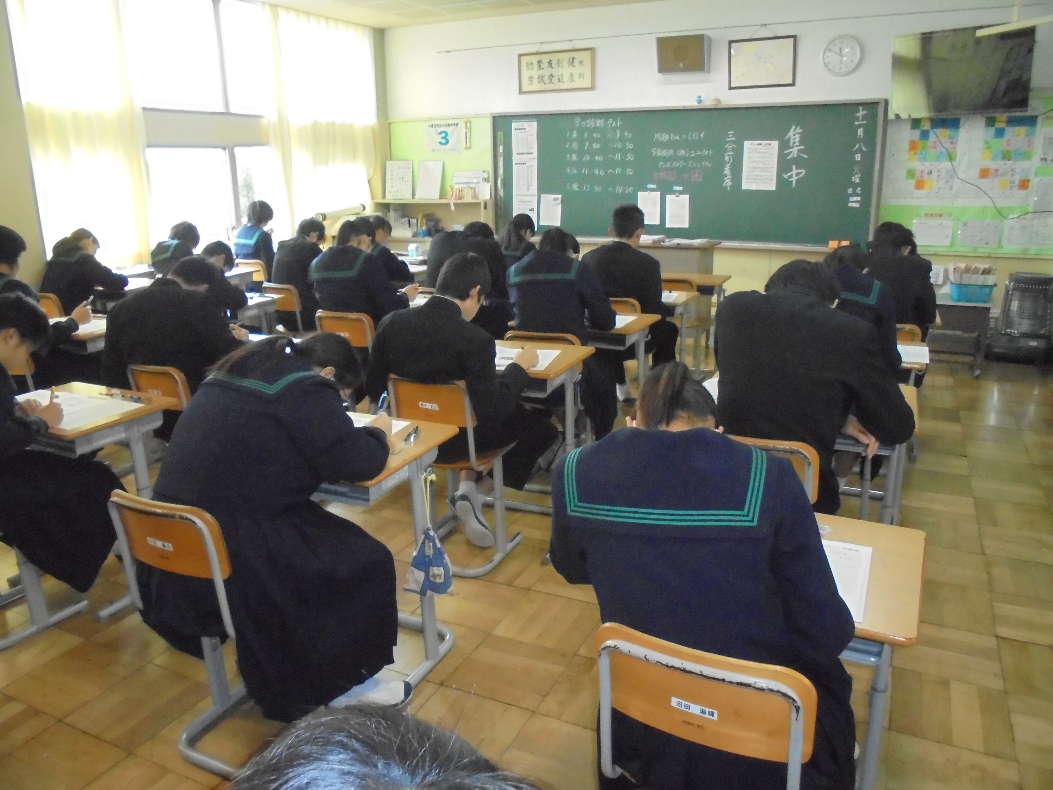 本日(8日)は県学力診断のためのテストの日です。3年生にとっては,全県的な学力を判断する貴重な機会です。私立受験校決定の三者面談を控えていることもあり,みんな真剣に取り組んでいました。