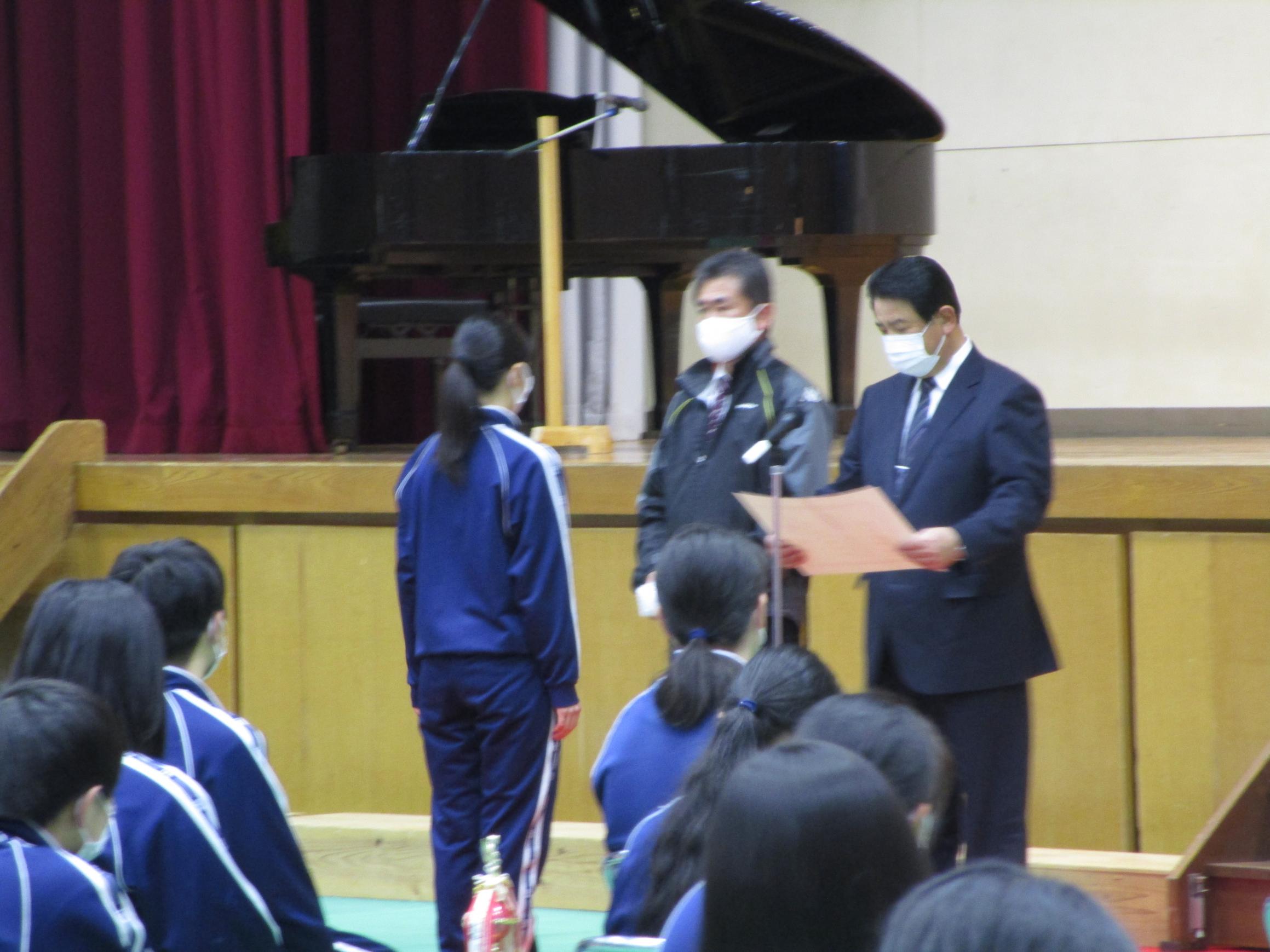 月曜日(8日)の「3年生を送る会」に先立ち,第61回自然科学観察コンクールの表彰がありました。3年生の千葉さんが佳作に入賞しました。全国大会での入賞は素晴らしい成果です。研究課題は「ふるさとの水辺を守るPart2~園部川他の水質検査」です。